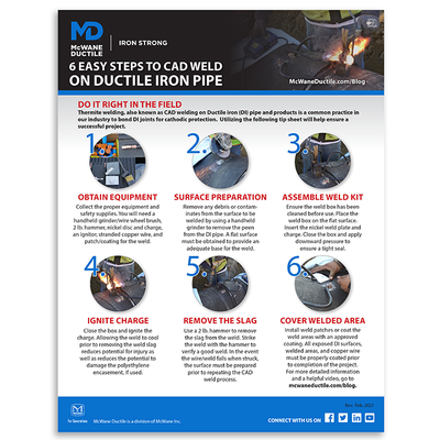 Be sure you and your crews know how to complete the CAD welding method correctly by downloading our handy tip sheet. Click the DOWNLOAD button below. If you have any questions regarding CAD welding or want to know more about DI pipe in general, please reach out to your local McWane Ductile Sale Representative.