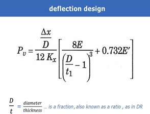 The net thickness (t) cannot be solved directly in these equations as it is buried in the bottom of a fraction within the denominator on the wrong side of the equal sign. This makes both designs an iterative process. In other words, "guess" at a D/t and D/t1 value, do the math with other known values involved, see if your result exceeds the known total trench load (Pv). If it does not, use a slightly higher or lower presumed D/t value until your result meets or slightly exceeds the known Pv value. Hence the somewhat hideous nature of this repeated "plug & chug ... & chug" design.