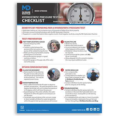 With this free Hydrostatic Pressure Test Preparation Checklist from McWane Ductile, you can avoid negative test results and succeed the first time!