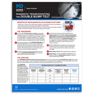 Reminder: Fill from the low end and bleed air from the high end to ensure that the supposed “leak” is not just an air bubble that is being compressed. We at McWane Ductile also provide a diagnostic tool known as the Double Bump Test (DBT) procedure designed to help you distinguish between a trapped air problem or an actual leak. More importantly, the DBT will establish the target rate of water loss per minute to guide the resolve.