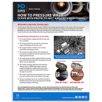 Need to clean your specialty-lined Ductile iron pipe? Use this tip sheet to safely and effectively pressure-wash Protecto 401 and/or cement lined pipe.