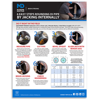 On occasion, you may encounter pipe where rounding is required, especially when assembling larger diameter pipe. Luckily, and when done properly, this simple 5-minute fix can ensure you keep your pipeline installation moving with efficiency. If you have any questions about pipe rounding, or to obtain an Internal Rounding Kit, please contact your local McWane Ductile Representative.