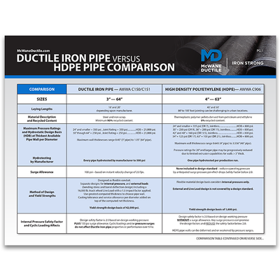 Higher strength, longevity, superior resistance to mechanical damage, corrosion resistance with coatings, and fire resistance are just some advantages of Ductile Iron Pipe over HDPE Pipe! Use this handy comparison sheet to ensure you select the proper pipe for your next project.
