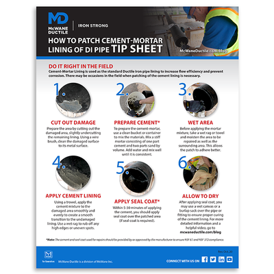 If the cement-mortar lining of your Ductile iron pipe gets damaged, don’t fret. It’s repairable! Know how to fix it correctly with this free Cement-Morter Lining Repair Tip Sheet.