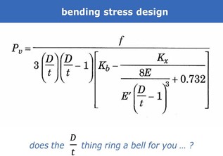 The D/t and D/t1 values are the "hard get" in this entire process. Once you have them, it's simply a matter of dividing the pipe's standardized outside diameter by each of these dimension ratios to obtain the net computed thickness for each, Bending Stress (D/t), and Deflection Design (D/t1). Important note - t1 includes the standardized allowance, which needs to be subtracted out later to find the computed net thickness.