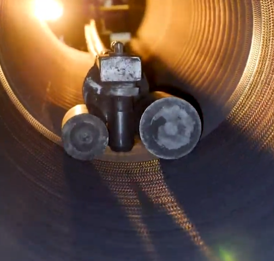 Commonly referred to as the peen, this precise pattern of circular dimples is machined into the forged-steel mold in which the pipe is made and serves as the mechanism for the initial build of the iron pipe wall during the centrifugal casting process. Without this peen pattern in place, the molten liquid iron would mostly slosh about inside the spinning mold in a non-productive irregular fashion.