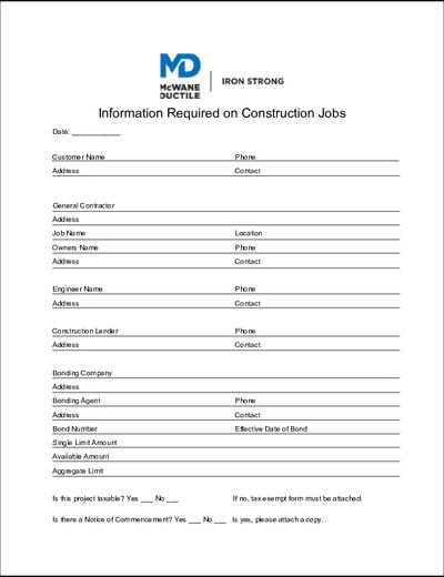 Prior to engaging with McWane Ductile for your water and/or wastewater poject, it is best to complete a Credit Application and Job Information Sheet. Please click the buttons below to download a copy of each.